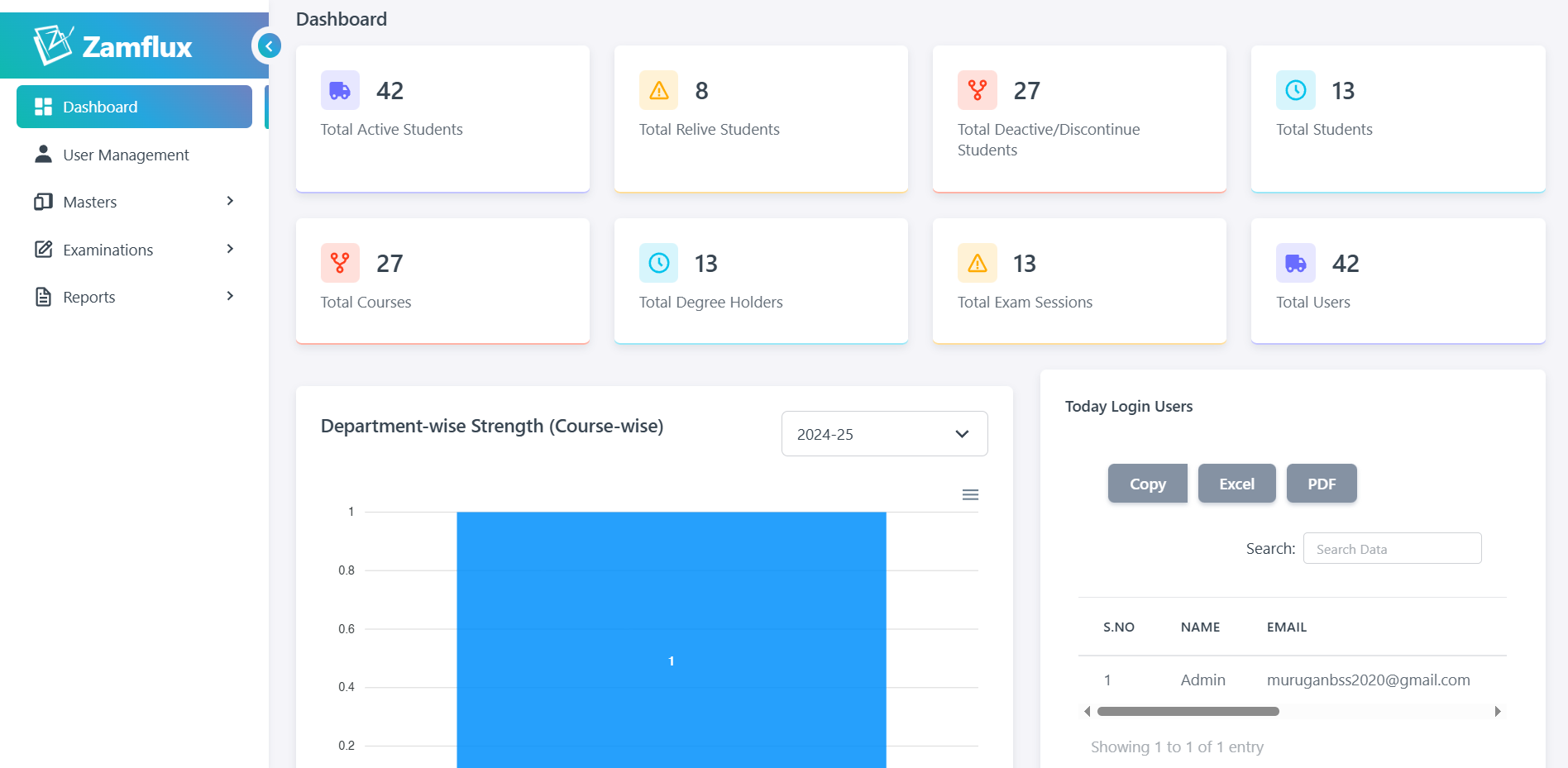 Real-time insights into exam schedules, hall-tickets, valuation progress, and results, Department-wise reports & analytics for institutional planning and tracking